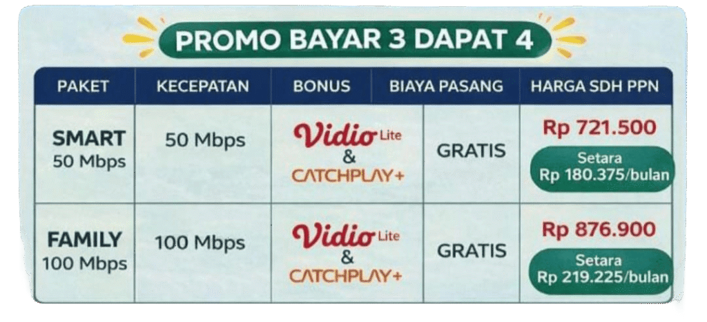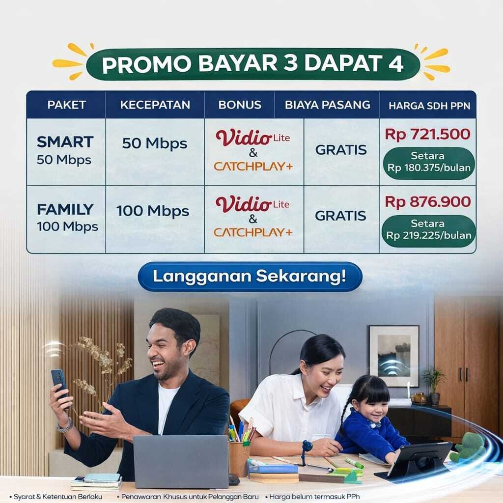 Bayar 3 Bulan Dapat 4 Bulan: Akses internet gratis pada bulan ke-4.